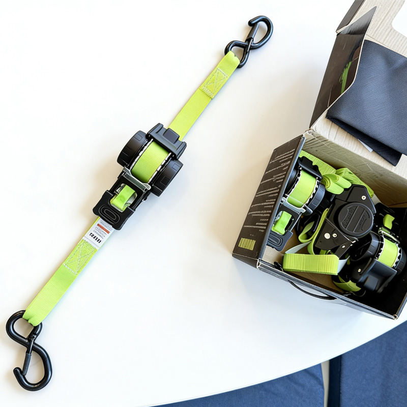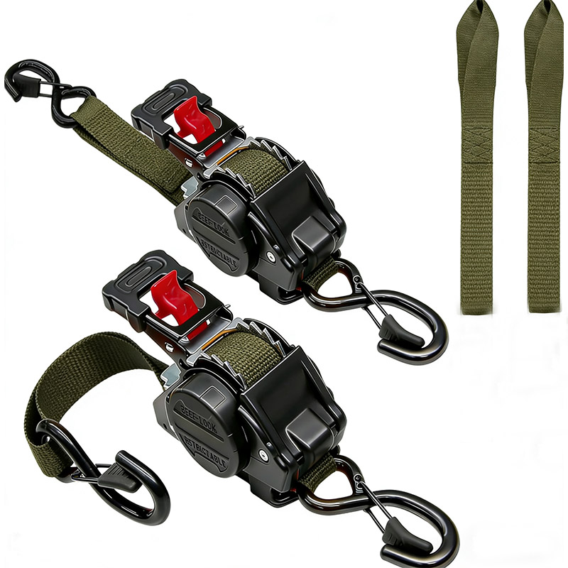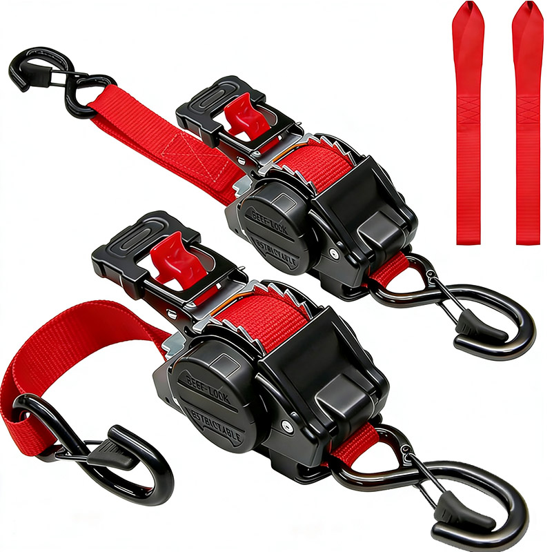 2 Pack 1” x 12' x 1800 LBS retractable ratchet straps tie down with S hook are commonly used in the trailer and storage industry to secure cargo to trailers. Our Self Retracting Motorcycle Tie Down Straps are designed for extreme durability and high security.